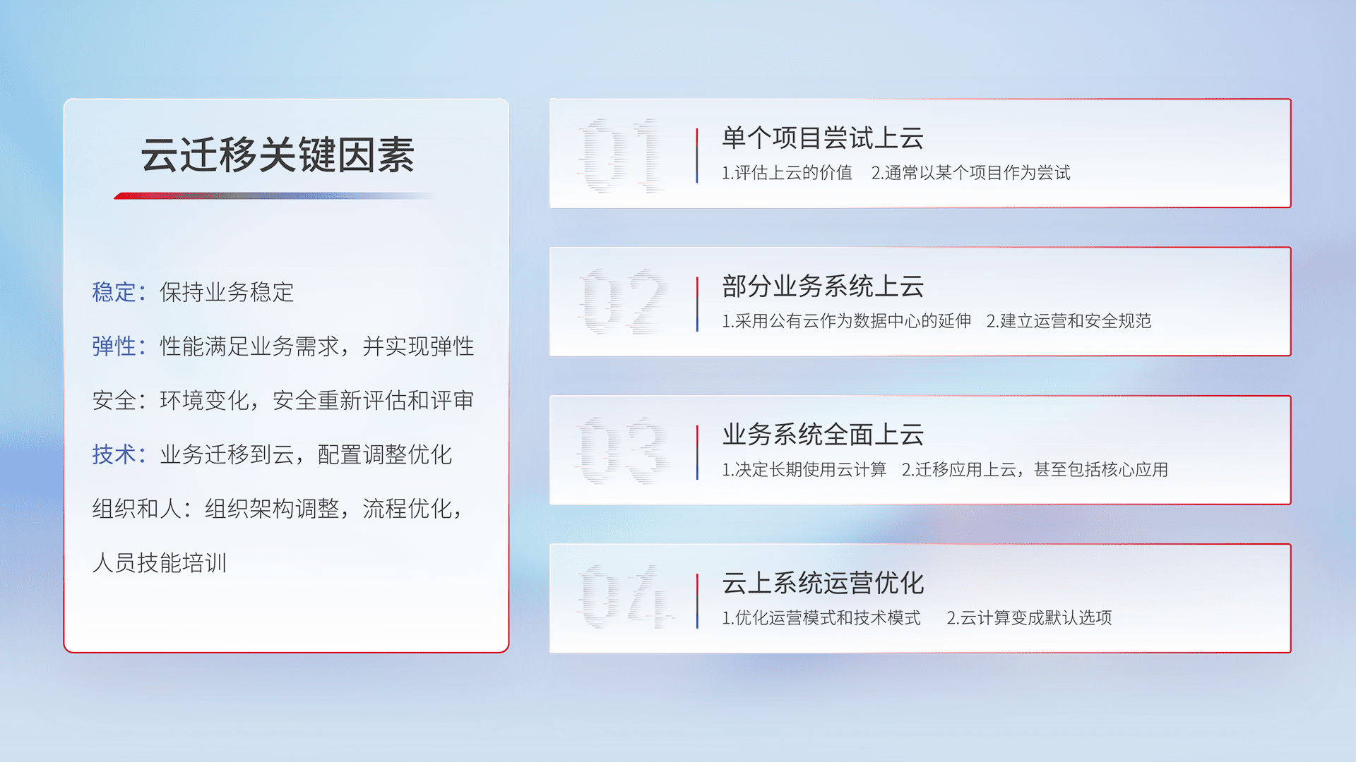 结合实际业务,,,,从规划设计、、云平台选型、、、、云原生改造、、、数据迁移、、集成交付,,迁移全过程为客户识别最佳上云路径,,,做好风险识别管理,,设计网络架构、、、身份权限、、、安全审计合规、、、、操作审计、、日志审计、、、、监控告警策略、、多站点容灾设计等,,,对云上基础设施进行整体规划,,,,提升IT治理水平,,,,以满足弹性、、高可用、、、高性能的需求。。。。