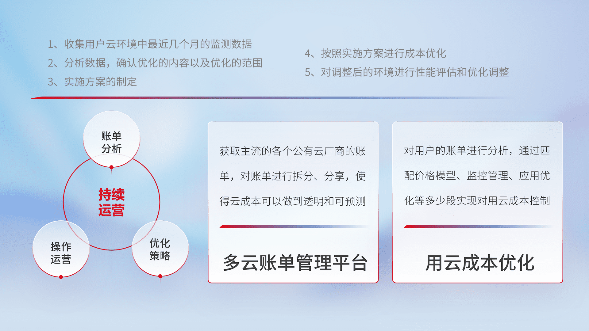 通过多云纳管,,,以统一的资源数据模型把客户的云资源进行抽象和封装,,,进而实现对多云资源的统一操作,,,保障云资源管理的可靠性、、稳定性与可用性。。量身定制化运维内容,,,,配置、、、、开发运维、、、、补丁管理、、、、备份、、、、监控、、认证和访问管理、、、、审计和日常巡检等,,,,保障在用云过程中的可靠度,,,稳定度以及高可用率。。。。